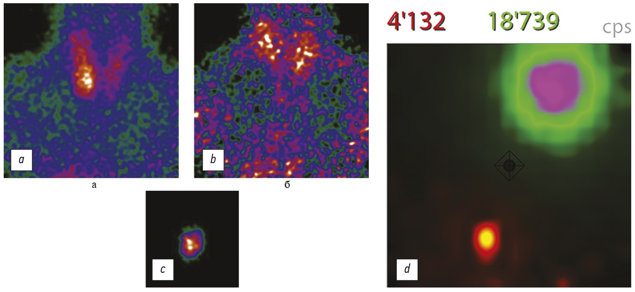 图 6。使用多通道伽马探测器 Sentiella-102 (a – c) 和 CrystalCam (d) 获得的图像。