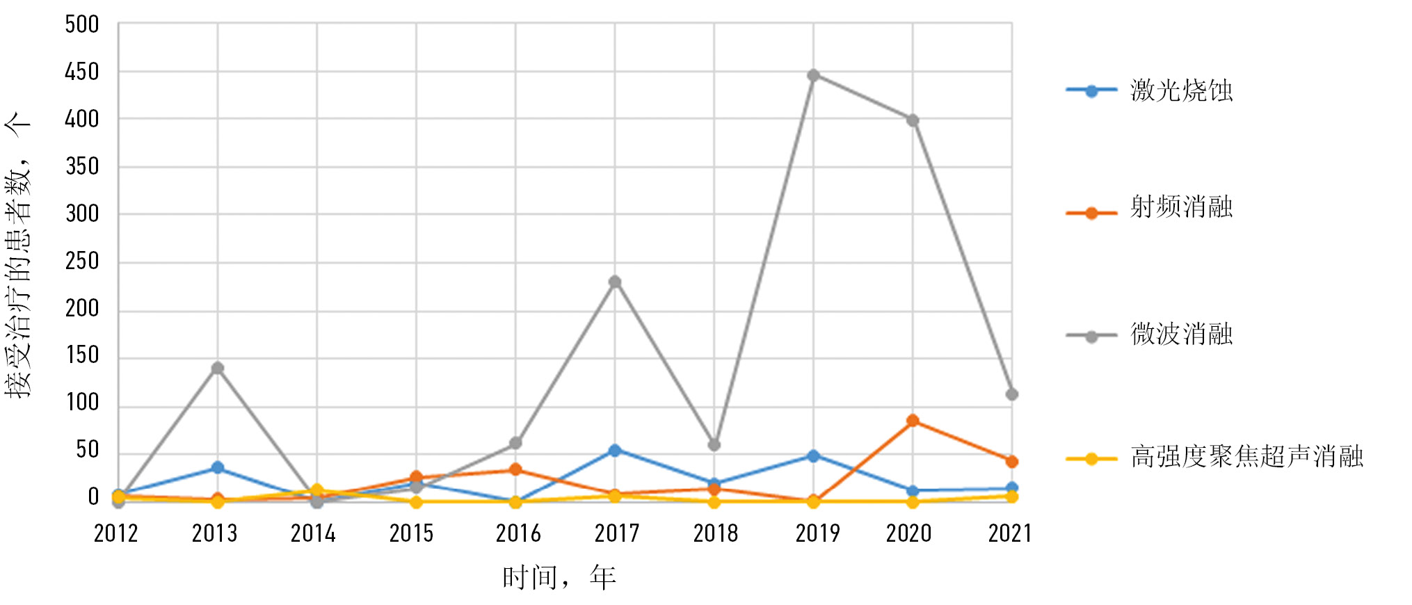 根据谷歌学术数据库发现,在功能亢进的甲状旁腺热破坏的出版物中,使用微波消融的数量最多,最小的——高强度聚焦超声(high-intensity focused ultrasound,HIFU)消融(图1)。