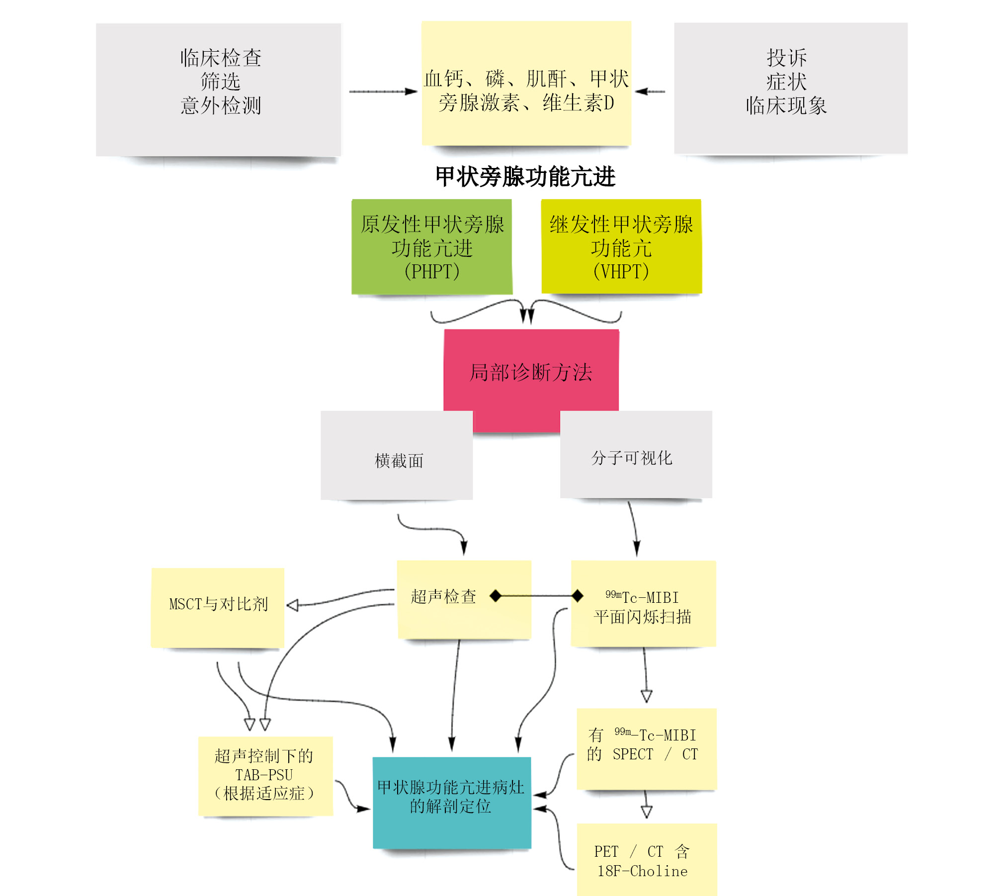 手术疗法 | • 血清中总钙的浓度超过0.25毫摩尔 / 公升(1毫克%)超过该实验室中设定的速率 • 降低肾小球过滤速度<60毫升/ 分/ 1.73平方米 • PHPT的内脏表现(ICD) • 每日排泄钙>400毫克/天(10毫摩尔) • T-Criterion上减少径向,股骨骨骼或椎骨骨骼的矿物质密度<-2.5 SD • 历史中低酒精骨折和/或放射学识别的椎体骨折(也根据MSCT或MRI) • 年龄<50年 | 根本疗法 | • 超声检查,闪烁图(SPECT/ CT,PET / CT) • CT与对比剂,PET/CT |