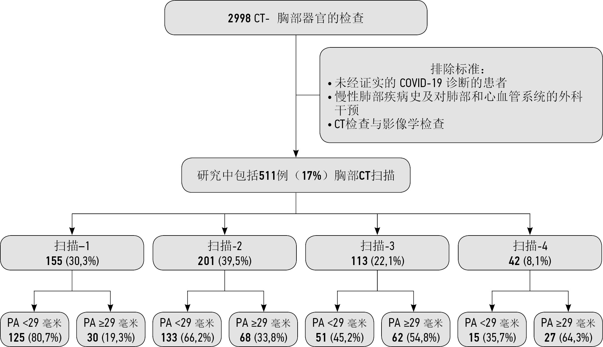 图 1研究设计。 CT - 计算机断层扫描; CT 1-4 - 用于视觉评估患者全身状况严重程度对 COVID-19 肺部变化的放射学迹象的性质和严重程度的依赖性的改编量表; PA-肺动脉。