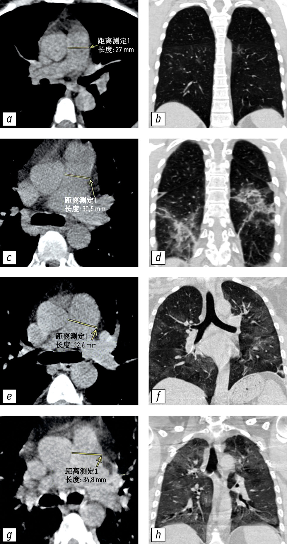PA 大小是在最宽点的轴向截面上测量的,垂直于血管的长轴(图 3,a,c,e,g)。 右肺动脉的最大直径处测量升主动脉的大小 [13]。 测量精度的限制是缺乏对比度增强、心脏同步和降低信噪比。 测量结果由两名放射技师进行的独立测量取平均值。如果评估实质损伤程度或测量大血管(超过2毫米)的结果存在显著差异,则考虑具有15年经验的第三位放射科医生的意见。