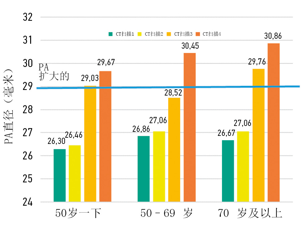 CT-1组最小病变体积(26.7±3.4;0.81±0.13)的PA直径和PA/Ao比率的平均值略高于Framingham心脏病研究[14]中确定的标准值,其中平均PA大小为-25.1±2.8毫米,平均PA/Ao比值为-0.77±0.09。也许这是由于方法上的特殊性:我们的测量是在没有心脏同步的情况下进行的,这可能导致测量的血管直径增加,并且研究组按性别进行不成比例的划分。50岁以下患者组的平均测量主动脉直径(31.2±3.7 毫米)与专门用于主动脉年龄测量的综述[15]中的结果(31.1±4 毫米)具有很好的可比性,在该综述中,由于血管壁弹性降低,主动脉直径也随年龄增加而增加。