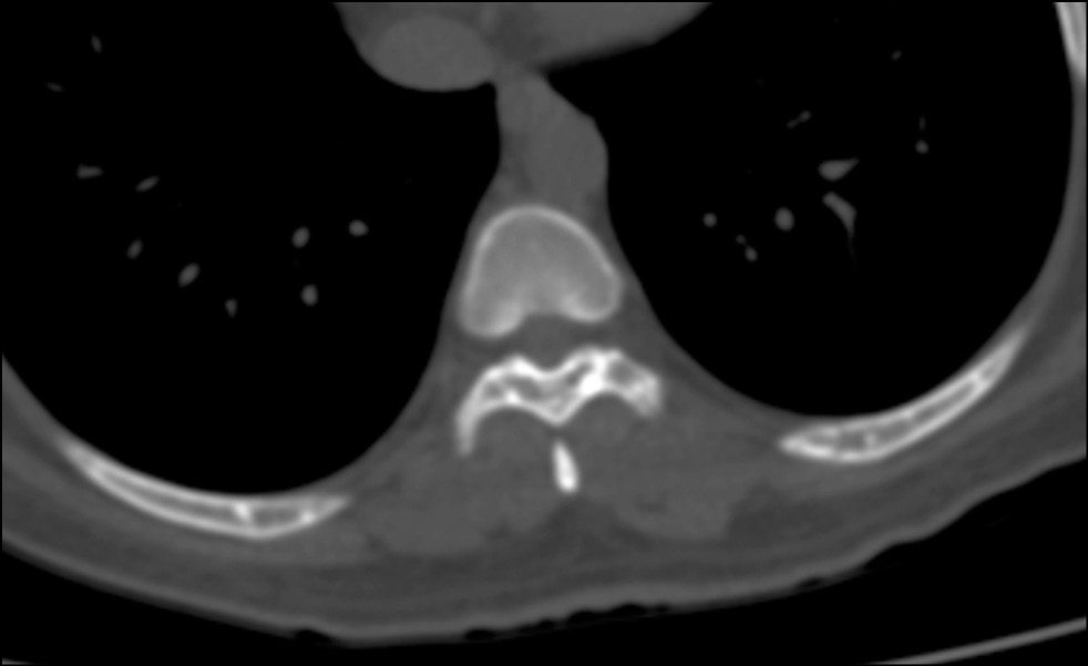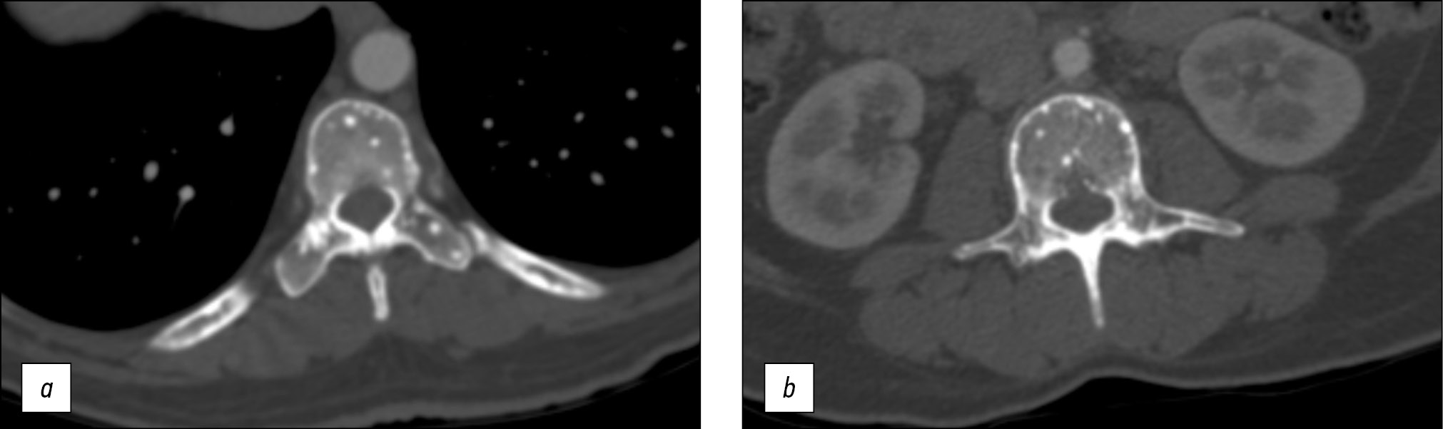 Fig. 1. Transverse cross-section computed tomography scan passing through the thoracic (a) and lumbar (b) spine. It shows numerous, well-defined, homogeneous, circular, hyperdense foci in spinous processes and vertebral arches.