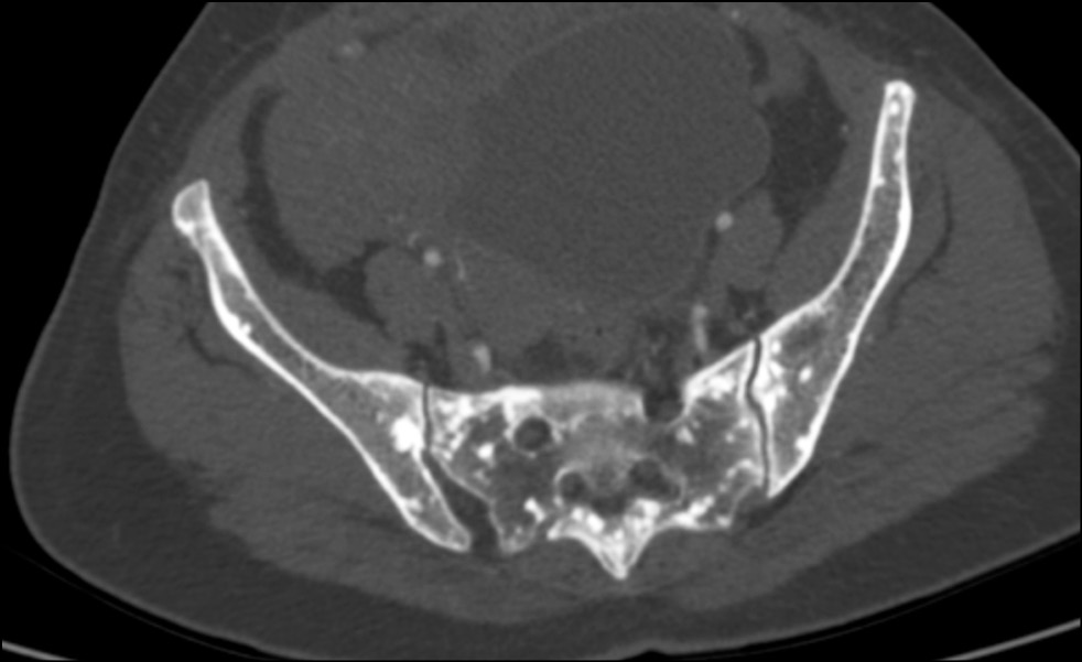 Fig. 3. Transverse cross-section computed tomography scan passing through the sacroiliac joints. It shows small, sclerotic, round opacities distributed symmetrically along sacrum, hip bone, and sacroiliac joints.