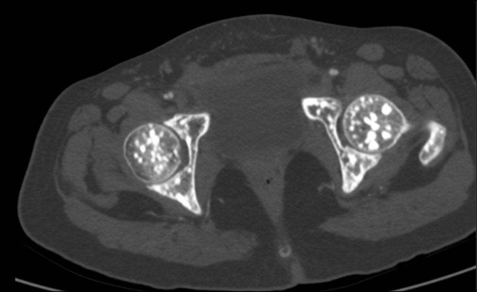 Fig. 4. Transverse cross-section computed tomography scan passing through the femoral head. It shows numerous hyperdense lesions that conform with the osteopoikilosis in the femoral head; lesions are well-circumscribed and are measured in millimeters.