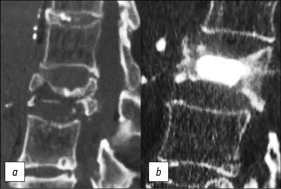 Fig. 3. (a): CT scan: Sagittal reconstruction of a complex vertebral fracture. (b): Post-operative CT control. Vessel-X is perfectly placed without BFM leakage.
