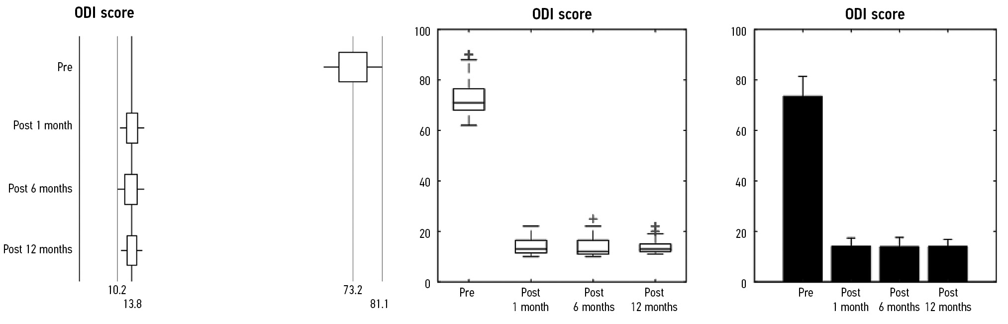 Fig. 4. The index is expressed in percentage points and ranges from 0% to 100%, with the lower limit related to the absence of disability and the upper limit to the maximum degree of disability (patients are bed-bound). At pretreatment, the median ODI score was 78% (25th percentile, 70.5%; 75th percentile, 84%); no outliers were identified. At 1 month post-treatment, the median ODI score was 14% (25th percentile, 12.7%; 75th percentile, 17%); no outliers were identified. At 6 months post-procedure, the median ODI score was 13% (25th percentile, 12%; 75th percentile, 16%); no outliers were identified. At 12 months post-procedure, the median ODI score was 13% (25th percentile, 12.4%; 75th percentile, 16%); no outliers were identified. The mean ODI scores decreased from 73.2±7.9 to 14.1±3.3 at 1 month and 13.8±3.6 at 6 months (p < 0.001).