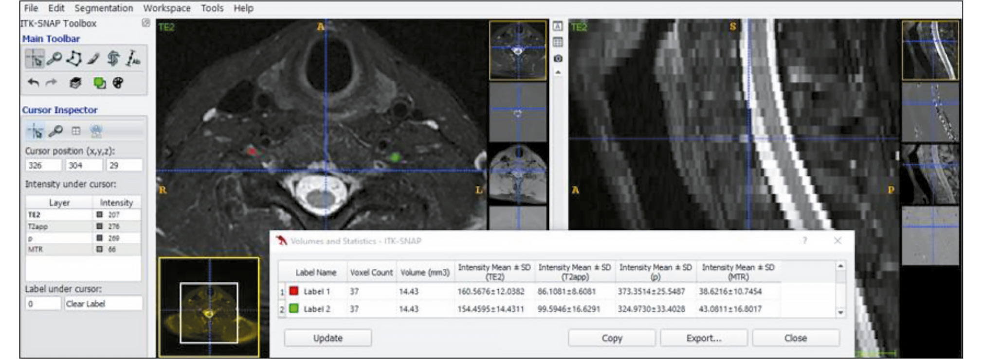 METHODS: Ten healthy volunteers were included. Their main demographic and anthropometric characteristics were recorded before they underwent magnetic resonance imaging. A 3T magnetic resonance imaging scanner was used. In addition to standard sequences, the scan protocol included regimens for obtaining T2 relaxation times and magnetization transfer ratios from nerve elements of the brachial plexus. Data were post-processed using the MATLAB software package. Then, regions of interest were manually assigned to in the maps, and numerical values were obtained. Furthermore, thickness of the nerve elements was measured. Data were statistically processed using the SPSS software.