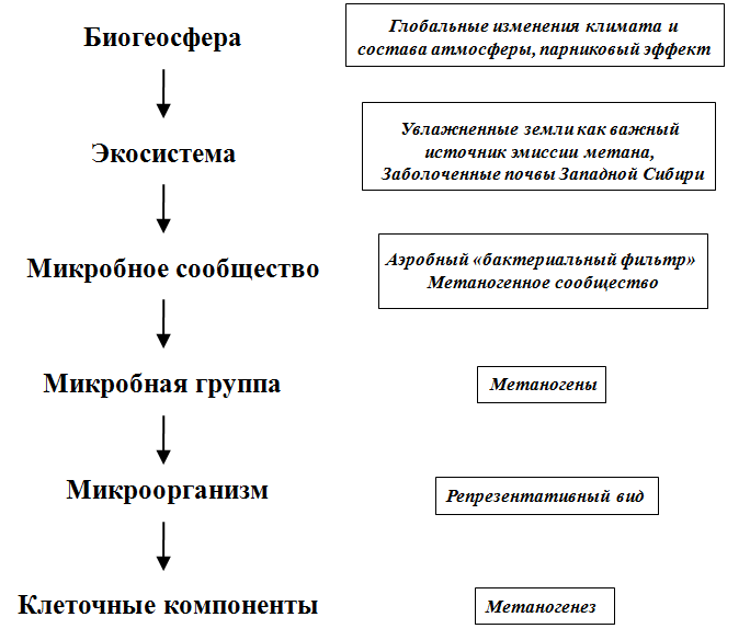 One of the challenging issues of global ecology at present is the problem of climate change caused by the emission of greenhouse gases into the atmosphere. Vast areas of West Siberian wetland ecosystems are the powerful sources of these gases. The application of a system approach to the study of this issue enables defining the appropriate hierarchy of interacting systems and their elements that play a key role in the biological processes under study (Fig. 1) and analyzing them by the use of a proper methodology.