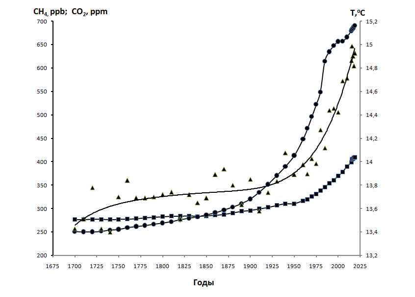 Changes in the composition of the atmosphere and climate is a planet-scale problem. These changes are caused by the permanent increase in atmospheric concentration of the main greenhouse gases - methane and CO2 [IPCC, 2013]. Along with an increase in the concentration of these gases, the rise of the average global temperature on Earth is observed at a rate of about 0.15°C per decade (Fig. 2). Such a temperature rise can subsequently have a strong impact on various regions of Earth. These impacts can be the melting of permafrost and polar glaciers, an increase in the frequency of extreme weather events and global changes in climatic zones.