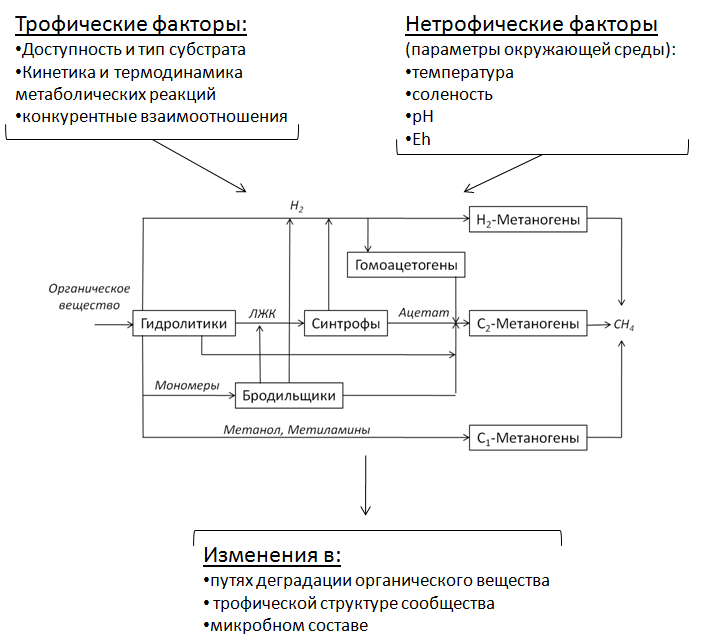 Thus, a combination of factors, both trophic and non-trophic, determines the result of competition between these two microbial groups for hydrogen. The role of homoacetogenic bacteria can increase in eutrophic systems at low temperatures, when sufficiently intense processes of degradation of organic matter occur [Kotsyurbenko, 2005]. In stable oligotrophic ecosystems, methanogens are the main terminal group, and the role of hydrogen-dependent methanogenesis can increase.