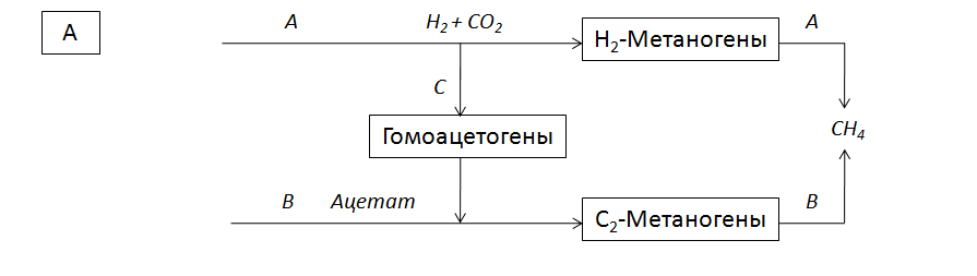 Homoacetogens have a higher growth rate compared to methanogens at low temperatures, typical of most terrestrial ecosystems, including bog systems, and are able to outcompete them for hydrogen if it is available in excess [Kotsyurbenko et al., 2001]. However, usually, under natural conditions, methanogens intercept H2, reducing and keeping its concentration inaccessible to homoacetogens due to a much higher affinity for this substrate. As a result of this competition, the consumption of hydrogen can take place via the homoacetogenic pathway A – C – B with subsequent consumption of acetate by methanogens and a corresponding increase in the contribution of acetoclastic methanogenesis to the total production of CH4 rather, than via the methanogenic pathway A – A (Fig. 4a).