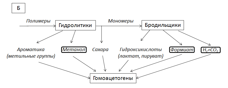 Depending on the type of organic matter entering the anaerobic zone, the trophic structure of the methanogenic community can vary greatly. If the main primary component is plant debris, then the complete trophic chain is formed. This is the most general situation happened in natural ecosystems.
