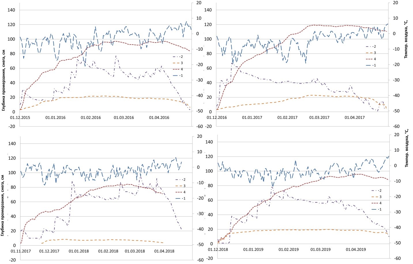 Рис.1. Изменения температуры воздуха и глубины промерзания по данным расчётов для покрытой снегом и оголённой поверхности грунта для метеостанции Терскол для зимних периодов 2015/16-2018/19 (1 – температура воздуха, 2 – толщина снежного покрова и 3 – расчётная глубина промерзания грунта под снежным покровом 4 – расчётная глубина промерзания оголённого грунта).