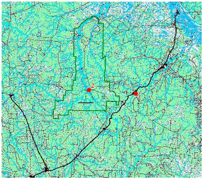 Рис. 1. Местонахождение заповедника «Малая Сосьва» (границы обозначены зеленой линией) и метеостанций: 1 – «Вонъеган» ; 2 – «Хангокурт».