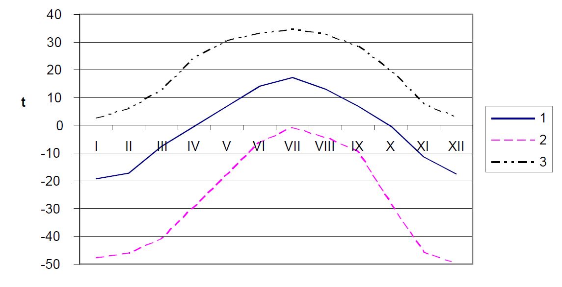 Рис. 2. Годовой ход температуры воздуха: 1 - средняя месячная; 2 - абсолютный минимум; 3 - абсолютный максимум.