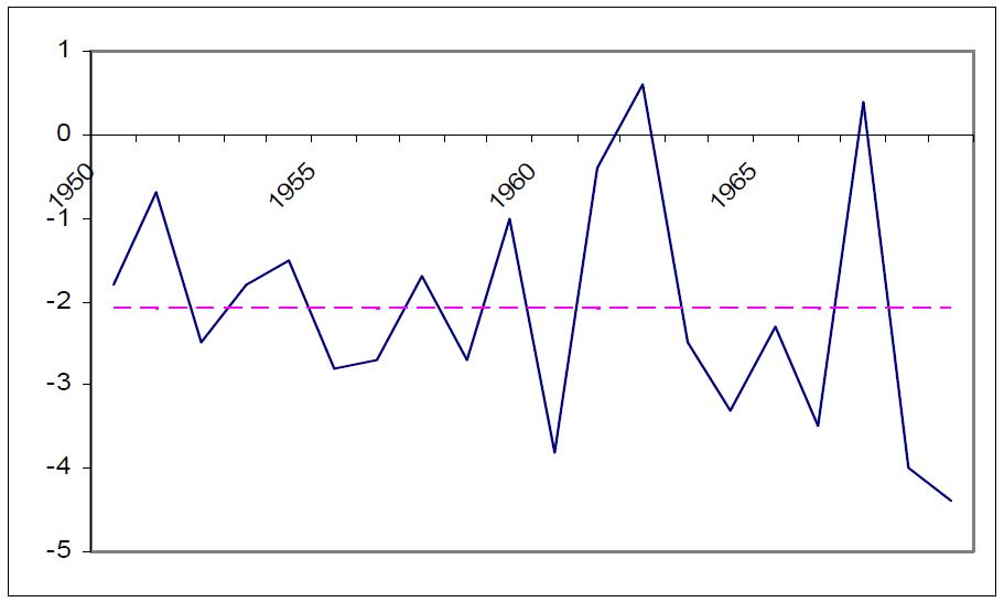 Температура воздуха, ˚С | Средняя годовая температура 1950-1969 гг. | -2,1 |