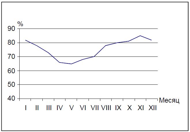 Обработка наших данных показала, что средняя относительная влажность воздуха за год составляет 76%. В весенне-летний период изменяется от 65 до 73%, в холодный период – 81-85%. Наименьшая величина приходится на апрель – май (65 -66%), наибольшая – на ноябрь (85%).