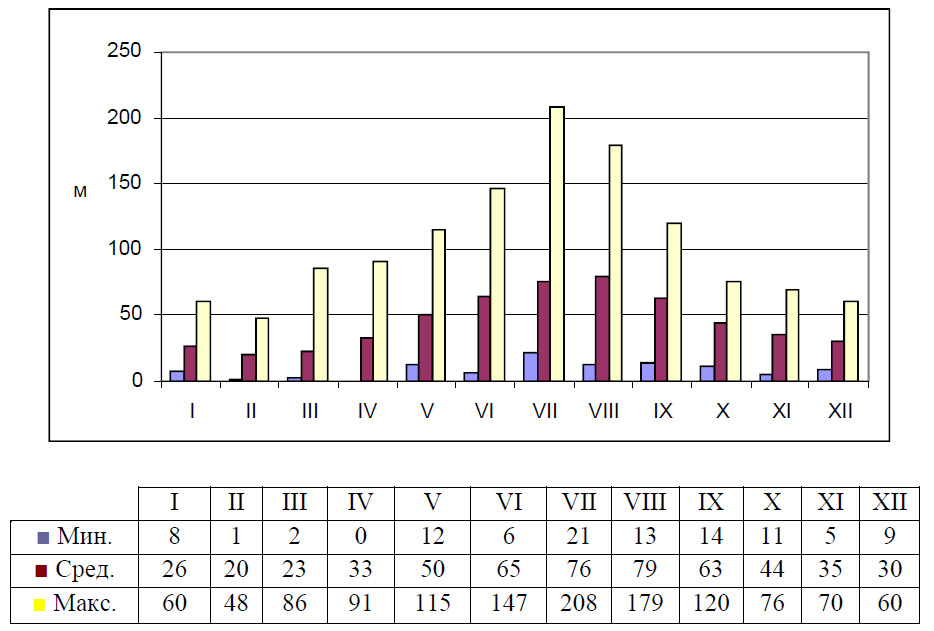 Изменчивость сумм осадков по месяцам в различные годы составляет большую разницу. Так, в июле 1962 г. выпало 208 мм – почти три месячных нормы, а в июле 1988 г. – всего 21 мм (28% нормы). В апреле 2002 г. осадков, можно сказать, не выпадало (0,4 мм), а в апреле 1997 г. сумма осадков составила почти три месячных нормы (91 мм). Такая изменчивость наблюдается и в зимние месяцы. Так, в феврале 1952 г. выпало всего 1 мм осадков при норме 20 мм, а в феврале 2002 г. – 48 мм, что более двух месячных норм. Суточный максимум осадков (78 мм) пришёлся на 21 августа 1989 г.