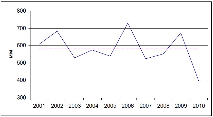 Среднее годовое количество осадков за 2001-2010 гг. составило 581 мм (табл. 16, рис. 8). Этот показатель увеличился по сравнению с периодом 1950-1969 гг. (500 мм) на 81 мм.