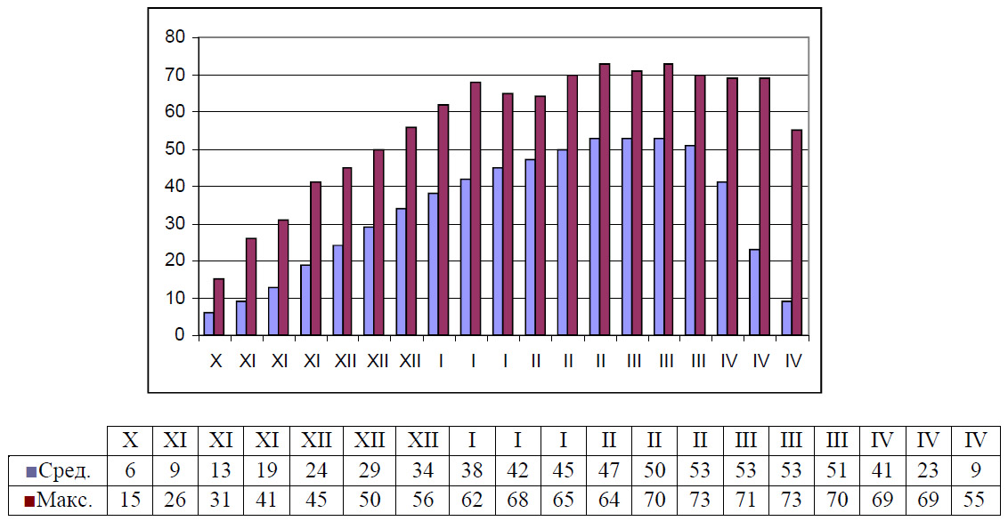 Среднее | 27 | 23 | 37 | 43 | 57 | 77 | 71 | 83 | 56 | 38 | 38 | 31 | 581 | 382 |