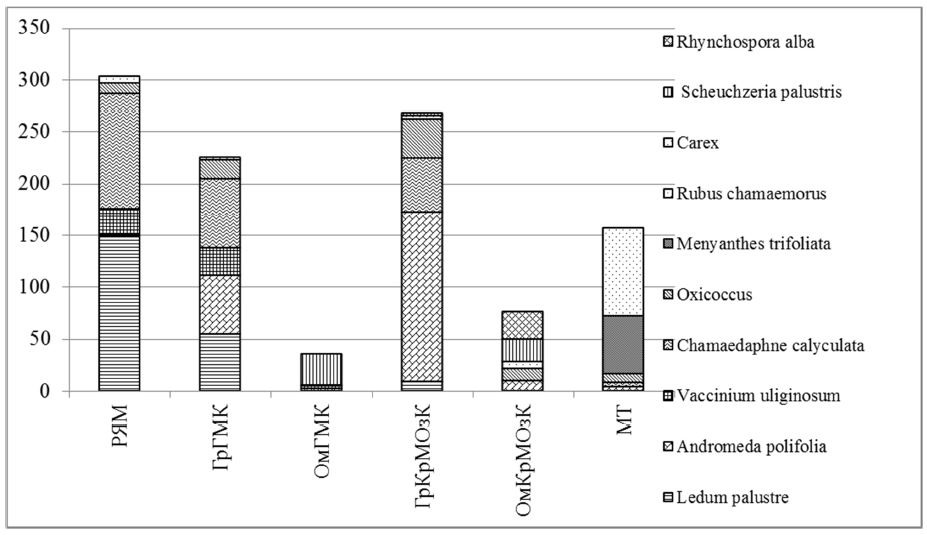 Количество живой фитомассы определяется типом экосистемы и растительным сообществом, а также степенью обводненности. В среднем общий запас фитомассы сообщества на повышенных элементах рельефа колеблется около 1900 – 2230 г/м2. Древесный ярус увеличивает запасы на ряме на 50-60%, на гряде ГМК на 40%, на кочках озеркового комплекса на 10%. Сильно отличается олиготрофная мочажина в ГМК, где запасы фитомассы имеют минимальные значения. Запас живой фитомассы мочажины в ГкрМОзК повышается и составляет 1726±230 г/м2.