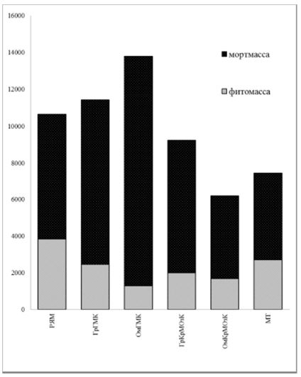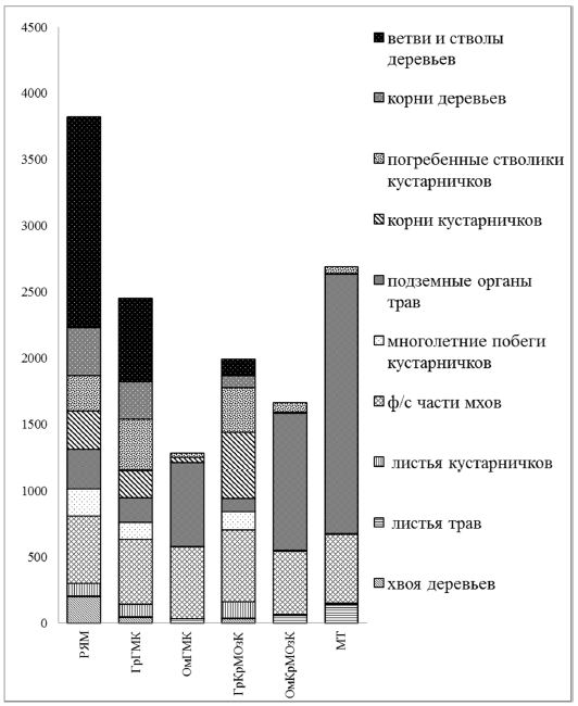 Фитомасса болотных экосистем средней тайги на территории заповедника изменяется от 1200 до 3820 г/м2 и определяется микрорельефом и видовым составом растительного сообщества (рис. 3). При увеличении дренированности и трофности экосистемы увеличиваются запасы живой фитомассы, что в свою очередь приводит к росту чистой первичной продукции. На повышенных элементах рельефа запасы достигают максимальной величины на Ряме 3821 ± 397 г/м2 (вклад древесного яруса – 56 %, кустарнички – 22, травы – 8, мхи – 13%); снижаются до 2453± 280 г/м2 на ГрГМК (древесный - 40, кустарнички – 33, травы – 8, мхи - 20%); на кочках ГркрМОзК еще ниже и составляют 1995 г/м2 (древесный ярус - 12%, кустарнички – 55, травы – 6, мхи - 27 %). На пониженных элементах рельефа в олиготрофных мочажинах ОмГМК запасы снижаются до 1285± 190 г/м, происходит изменение в структуре фитомассы. Снижаются запасы фитомассы кустарничков и увеличиваются запасы трав и мхов (кустарнички – 6, травы – 52, мхи - 42%). А вот в озерковых комплексах происходит увеличение запасов фитомассы в ОмкрМОзК до 1663± 207 г/м2 (кустарнички – 7, травы – 65, мхи – 28%). С увеличением трофности в корнеобитаемом слое в топи МТ запасы увеличиваются до 2692± 360 г/м2 за счет трав (кустарничковый – 3, травы – 78, мхи – 19%). Таким образом, на повышенных элементах рельефа в экосистемах ряма и гряд, общий запас фитомассы сформирован в основном подземными органами кустарничков, большая часть приходится на фракцию погребенных стволиков. В мочажинах запас формируется мхами и травами, причем подземная фитомасса трав преобладает.