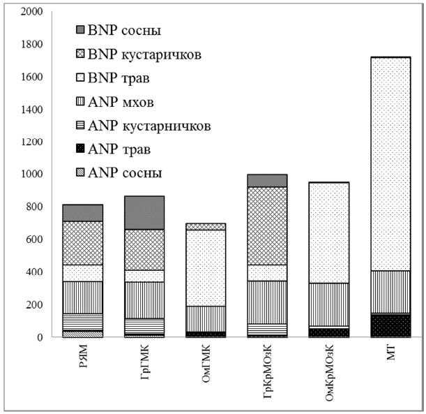 Рис. 4. Чистая первичная продукция (NPP) в болотных экосистемах, (ANP – надземная продукция, BNP – подземная продукция, г/м2 в год).