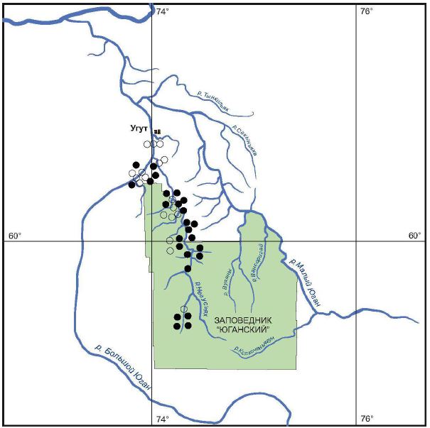 Рис. 1. Карта-схема района исследований ‒ бассейна р. Большой Юган. Кружками обозначены места проведения сборов моллюсков в 2016 г., закрашенные кружки означают находки редких видов.