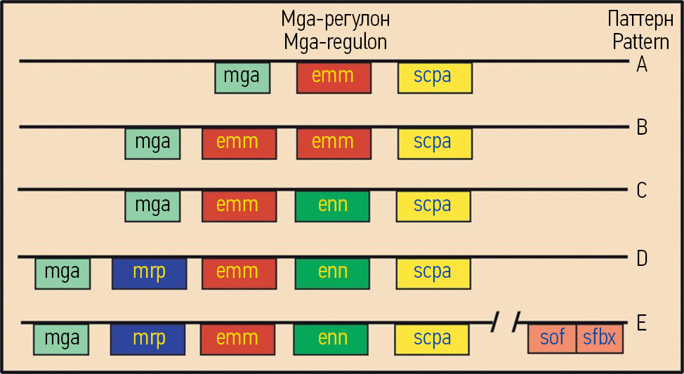Рис. 3. Генетическая организация Mga-регулона Streptococcus pyogenes [35]: Mga — регулятор ряда генов СГА, наиболее заметные из них семейство М-белков, гены которых тандемно связаны: emm кодирует типоспецифический белок Eмм, mrp и enn — М-подобные белки, scpa кодирует пептидазу C5a. Некоторые серотипы содержат только mga, emm и scpa (паттерн A). Другие серотипы содержат один или несколько оставшихся генов (паттерны B–E)