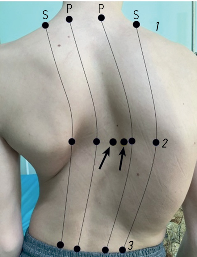 Рис. 1. Области обследования кожи спины у подростков с идиопатическим сколиозом (мальчик, 16 лет). P — паравертебральные линии; S — лопаточные линии, расположение относительно вершины деформации: 1 — проксимально; 2 — на уровне вершины деформации; 3 — дистально. Стрелками обозначены места забора интраоперационного материала для гистологического исследования в области вершины дуги деформации