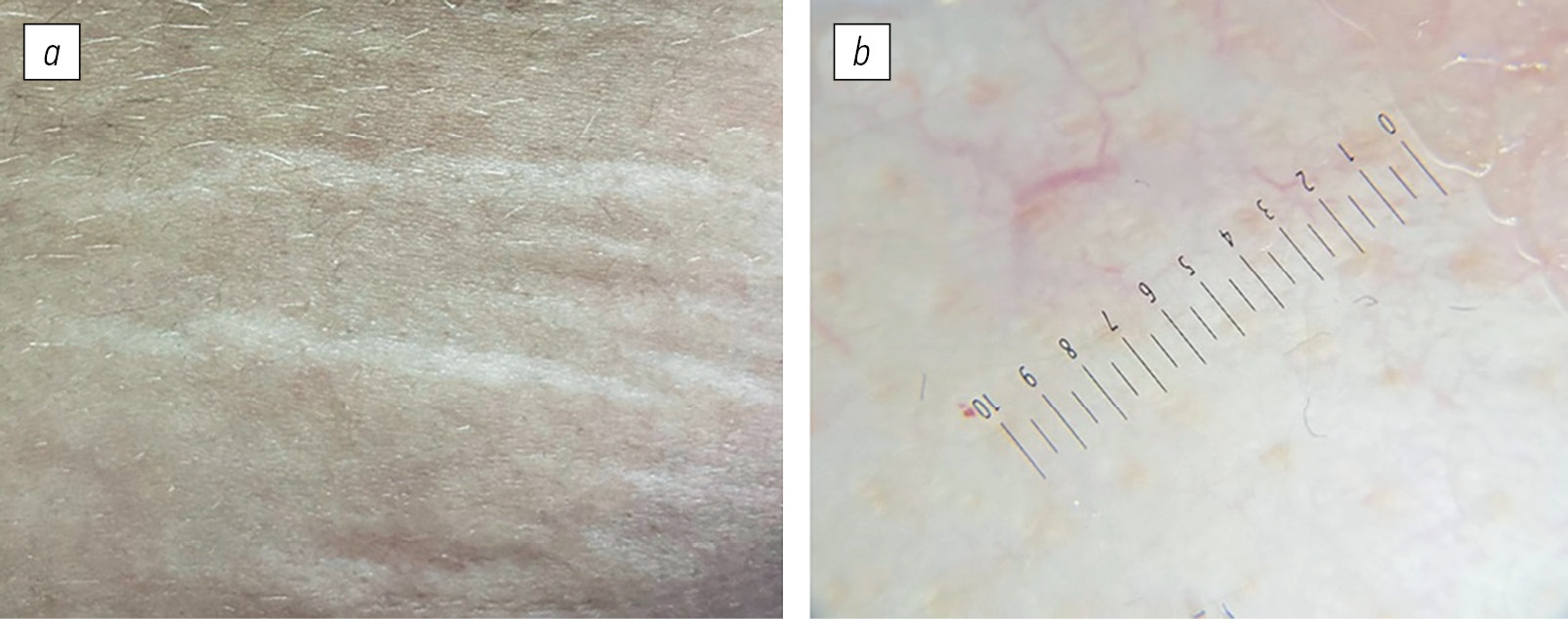 Рис. 2. Примеры визуальных изменений кожного покрова спины подростков с идиопатическим сколиозом: а — стрии; b — выраженная сосудистая сеть