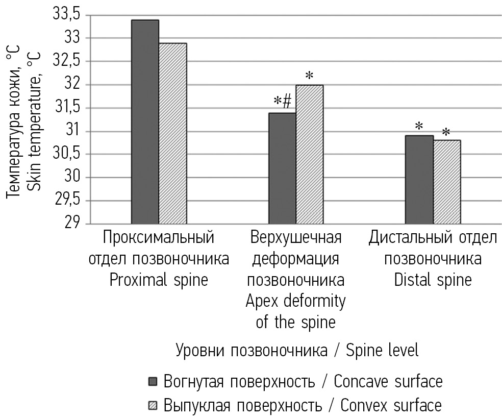 Рис. 3. Показатели локальной температуры кожи спины в паравертебральной проекции на уровне различных отделов у подростков с идиопатическим сколиозом. # Достоверность отличия показателей вогнутой стороны от выпуклой, р < 0,05; * достоверные отличия от величин, полученных в проксимальной области, р < 0,05