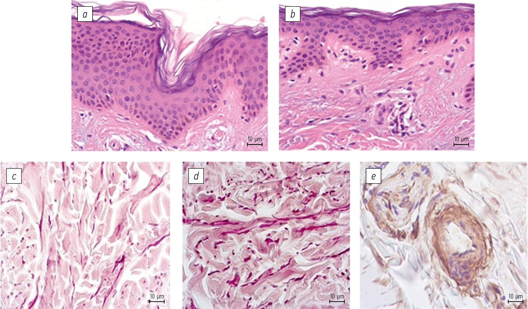Рис. 4. Особенности гистоструктурной организации кожного покрова спины подростков с идиопатическим сколиозом в области вершины дуги деформации: а – эпидермис с вогнутой стороны; b — эпидермис с выпуклой стороны; эластические волокна в сетчатом слое дермы с вогнутой (с) и выпуклой (d) стороны; е — деструктивные изменения артерии и нервного ствола на границе сетчатого слоя дермы и гиподермы. Окраска: а, b — гематоксилином и эозином; с, d — орсеином по Тенцеру – Унну; е — иммуногистохимическое окрашивание с использованием антител к СD34. Увеличение ×400