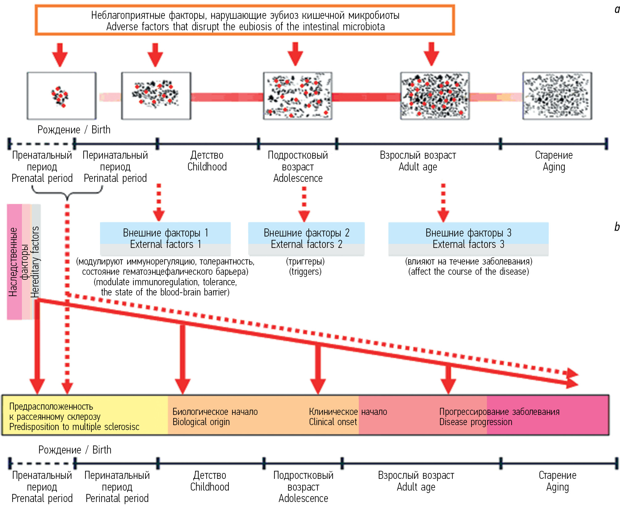 Общие факторы, влияющие на развитие РС и на состав кишечной микробиоты, поддерживают эту точку зрения (табл. 1) и позволяют предположить, что изменение состава микробиоты кишечника (дисбиоз) может влиять на все этапы патогенеза РС.