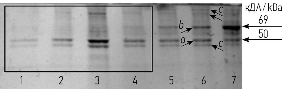 Рис. 1. Пример полиакриламидного геля. Номерами отмечены фракции, собранные после ультрацентрифугирования. Фракции с наибольшей степенью чистоты от БСА и с наибольшим содержанием целевого N-белка выделены рамкой. Стрелками указаны полосы: a — N-белка; b — БСА; c — примесных белков. БСА — бычий сывороточный альбумин
