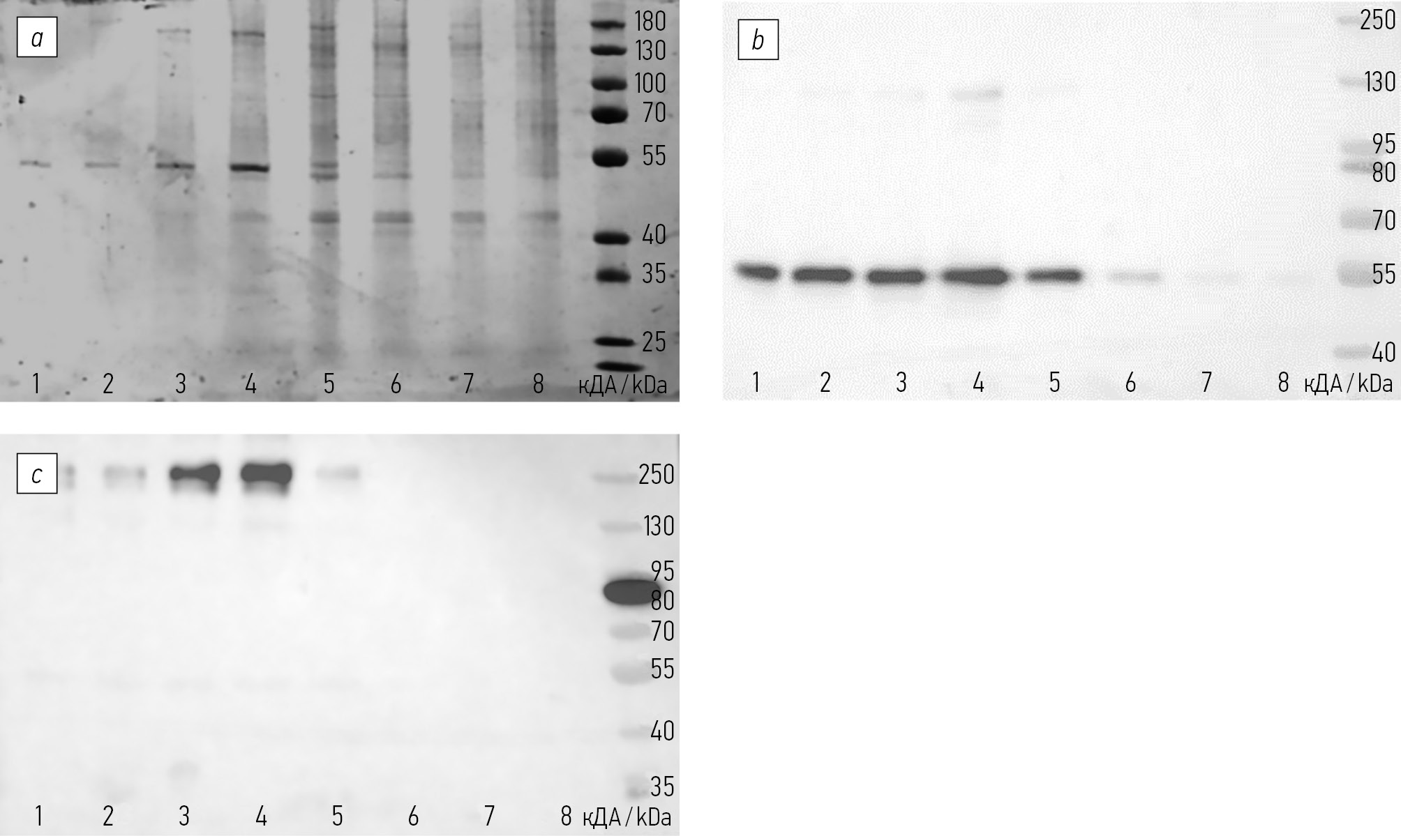 Для подтверждения наличия цельновирионных частиц определяли, в каких фракциях содержатся целевые белки N и S методом вестерн-блота (рис. 3). На поликриламидном геле обнаружено, что фракции с наибольшей чистотой от примесных белков, БСА и наибольшим содержанием N-белка (рис. 3, фракции 1–4) соответствовали тем же фракциям (1–4) на вестерн-блоте, у которых наблюдалось свечение на уровне молекулярной массы 55 кДа, что соответствует N-белку (рис. 3, b), и на уровне молекулярной массы ~200 кДа, что соответствует S-белку (рис. 3, c).