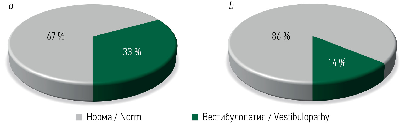 Данные о пациентах обеих групп, имеющих вестибулярные нарушения, приведены на рисунке.