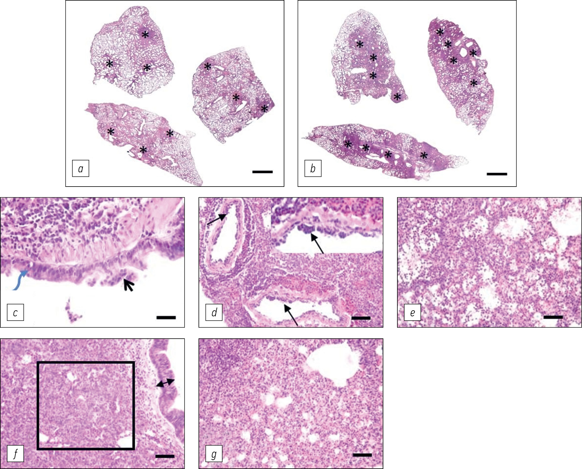 Fig. 3. Typical histopathologic features of the SARS-CoV-2 induced lung pathology: a — localized bronchogenic inflammatory foci; b — abundant inflammatory fields extending further in the lung tissue; asterisk — foci and/or diffuse mixed cell infiltrate; c — suppurative bronchiolitis — polymorphonuclear leukocytes and lymphocytes infiltrating partially ruptured bronchiolar wall; foci of necrotized (blue arrow) and syncytial multinucleated cell transformation (black arrow) bronchiolar epithelium; d — endothelialitis — endothelium lift off basal lamina by transmigrating inflammatory cells (arrows), severe vessel wall edema and abundant perivascular cuffing with mixed cell infiltrate; e — mononuclear infiltration and interalveolar septa thickening, prevailing intraalveolar edema with intraluminal hemorrhage, fibrin, cell debris and transmigrating macrophages; f — bronchiolar metaplasia of the alveolar epitelium, scattered type II pneumocyte hyperplasia amid the inflammatory alveolar lesion, also noted bronchiolar epithelium hyperplasia with cells pilling up (double arrow); g — diffuse alveolar damage — mixed inflammatory infiltrate: prevailing cells are lymphocytes, polymorphonuclear leukocytes and macrophages against the background of the intraalveolar edema and loss of structure. H&E stain, 50 magnification, scale line 2 mm (a–b), 200 magnification, scale line 100 µm (c–g)