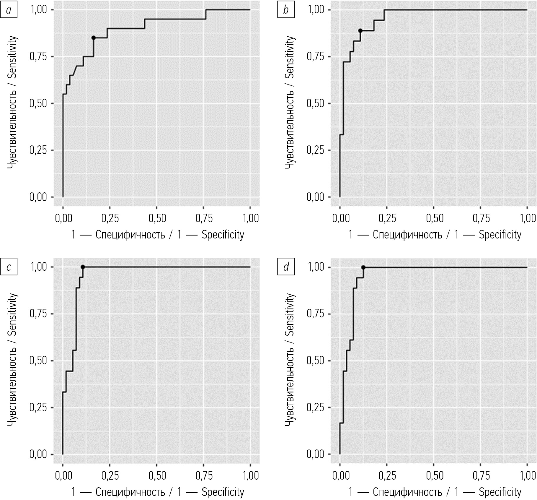 Статистический анализ данных проведен с помощью языка статистического программирования и среды R (версия 4.2.1) в интегрированной среде разработки RStudio Server. Распределение непрерывных и дискретных количественных переменных в выборке представлены как среднее арифметическое и стандартное отклонение (M ± SD) для нормально распределенных случайных величин, медиана и квартили (Me [Q1; Q3]) для величин, распределение которых отличается от нормального. Категориальные показатели представлены как абсолютное число и доля в процентах [n (%)]. Соответствие выборки нормальному распределению определяли с помощью теста Шапиро – Уилка. Использовали логистический регрессионный анализ с построением ROC-кривых. Тестирование статистических гипотез о различии распределения количественных переменных в независимых выборках проводили с помощью метода Манна – Уитни, критерия Краскела – Уоллиса. Различие в распределениях категориальных переменных тестировали с помощью критерия хи-квадрат и точного критерия Фишера. Нулевую гипотезу в статистических тестах отклоняли при уровне значимости p < 0,05.