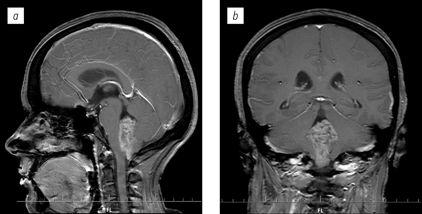 Рис. 2. Дооперационные магнитно-резонансные томограммы с контрастным усилением пациентки Я. в сагиттальной (а) и коронарной (b) проекциях