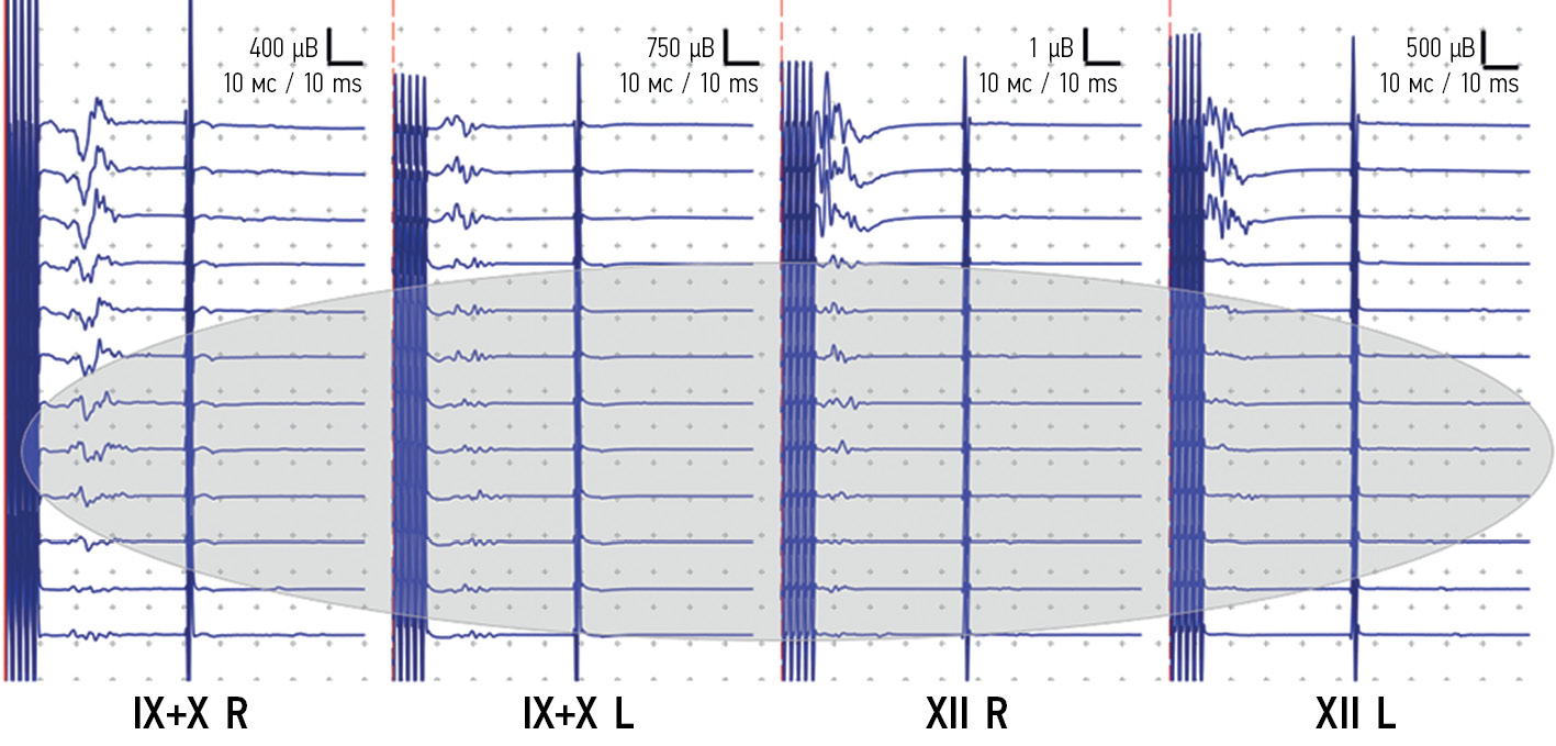 Необходимость использования данного метода в нейрохирургии, а именно во время нейрохирургических операций на структурах задней черепной ямки, обусловлена такой особенностью данных операций как высокий риск возникновения бульбарного синдрома после оперативного вмешательства (до 30–50 %), развитие которого нередко требует лечения в отделении реанимации [6–9]. У наших пациентов нарастание симптоматики со стороны каудальной группы черепных нервов наблюдалось в 35 % случаев, 14 % были с грубыми бульбарными нарушениями, им после операции потребовалась трахеостомия и продленная ИВЛ для протекции дыхательных путей. Поэтому существует необходимость оценивать функцию каудальной группы черепных нервов во время оперативного вмешательства для прогнозирования появления бульбарного синдрома с целью определения тактики ведения пациента в раннем послеоперационном периоде (пролонгированная ИВЛ, установка трахеостомы, зондовое питание и т. д.) для снижения риска аспирации и присоединения инфекционных осложнений дыхательных путей [10, 11].