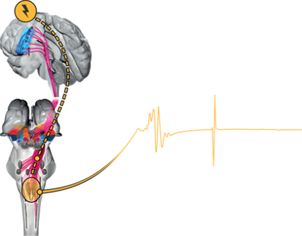 Работа посвящена одной из модальностей интраоперационного нейрофизиологического мониторинга, а именно КБ-МВП. КБ-МВП — результат нейрофизиологической активации кортикобульбарного тракта при стимуляции моторной зоны коры электрическим током (рис. 4) [1, 4, 5].