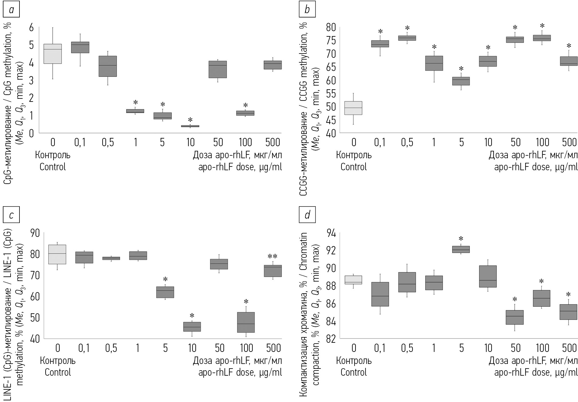 Обнаружено, что воздействие apo-rhLF в течение 72 ч приводило к эпигеномным изменениям в клетках IMR-32. При этом разные дозы по-разному влияли на степень компактизации хроматина (Н = 99,91, ν = 8, p < 0,001) и полногеномное метилирование CpG динуклеотидов на тотальном уровне (Н = 80,82, ν = 8, p < 0,001), CpG в CCGG-сайтах (Н = 158,56, ν = 8, p < 0,001) и CpG в LINE-1 (Н = 73,32, ν = 8, p < 0,001) (рис. 2, табл. 3).
