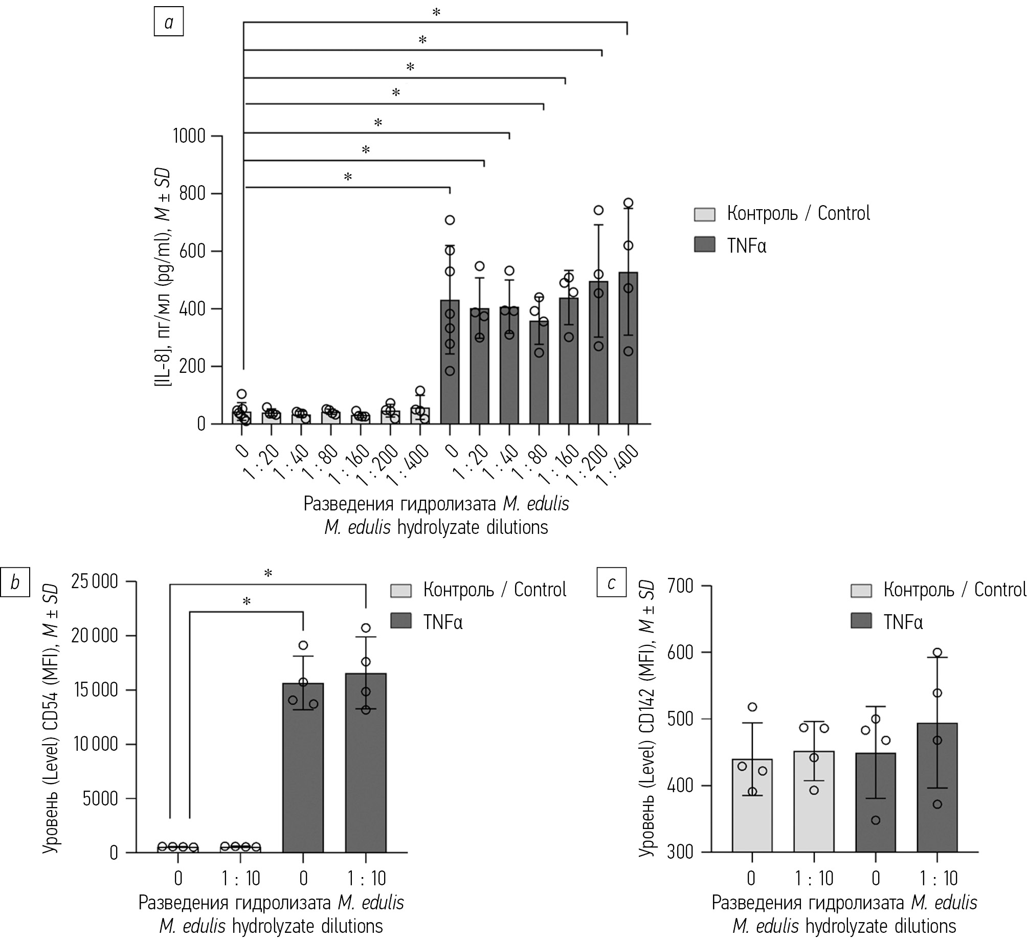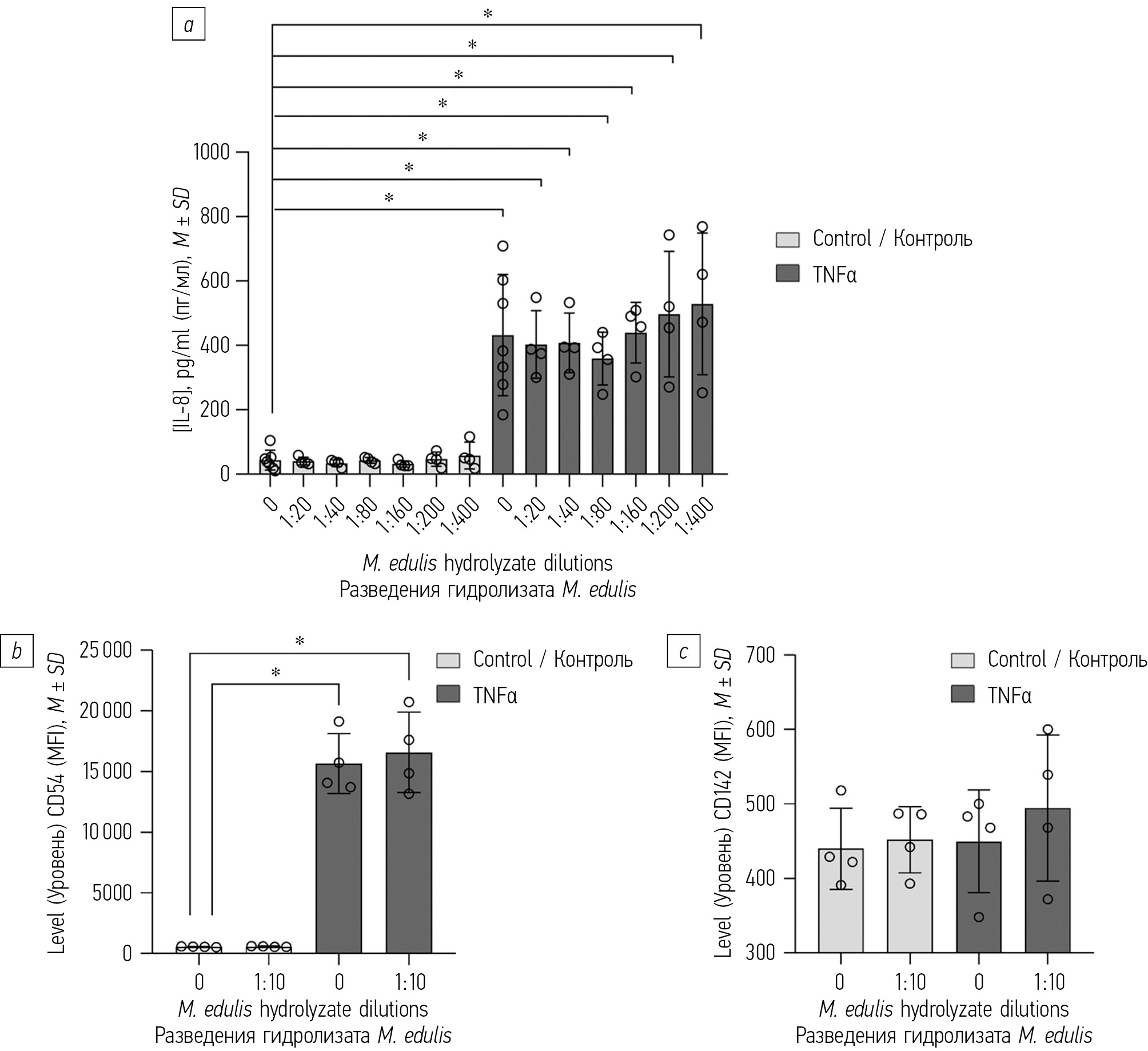Рис. 4. Влияние гидролизата M. edulis на секрецию IL-8 (a) и экспрессию активационных маркеров: адгезионной молекулы CD54 (ICAM-1) (b) и тканевого фактора CD142 (c) эндотелиальными клетками EA.hy926. Определение концентрации IL-8 в супернатантах клеточных культур проводили с помощью иммуноферментного анализа. Экспрессию поверхностных молекул CD54 и СD142 на эндотелиальных клетках оценивали с использованием моноклональных антител и проточной цитометрии. Различия достоверны по сравнению с контролем при: * р < 0,001; n = 8 (a), 4 (b, c)