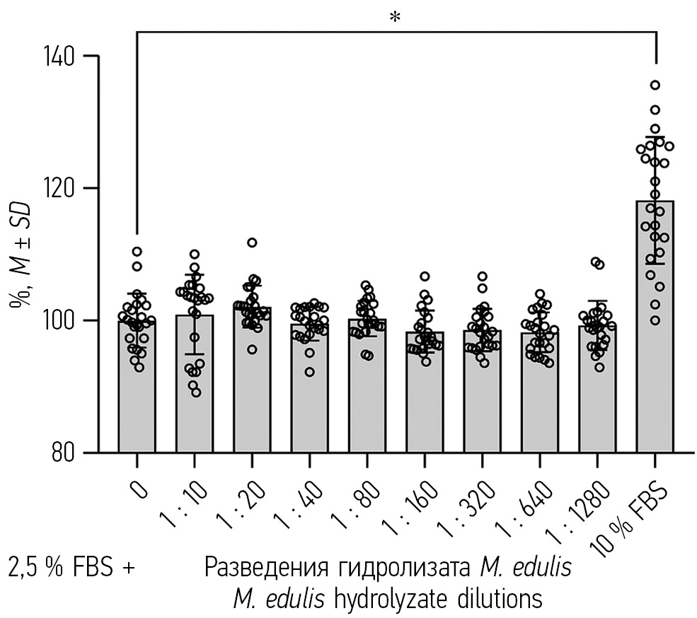 Рис. 1. Влияние гидролизата M. edulis на активность митохондриальных дегидрогеназ клеток линии EA.hy926. Влияние препарата на эндотелиальные клетки оценивали с помощью МТТ-теста. Результаты выражали в процентах, принимая за 100 % оптическую плотность в контрольных лунках, содержащих культуральную среду без добавок. Здесь и далее полученные данные проверяли на нормальность распределения с помощью теста Шапиро – Уилка. Оценку достоверности различий между контрольными и опытными выборками проводили методом однофакторного дисперсионного анализа ANOVA (p < 0,001), попарное сравнение средних значений производили при помощи апостериорных тестов Даннетта и Тьюки. Данные представляли как среднее значение (М) ± стандартное отклонение (SD). Различия достоверны по сравнению с контролем при: * р < 0,001; n = 24