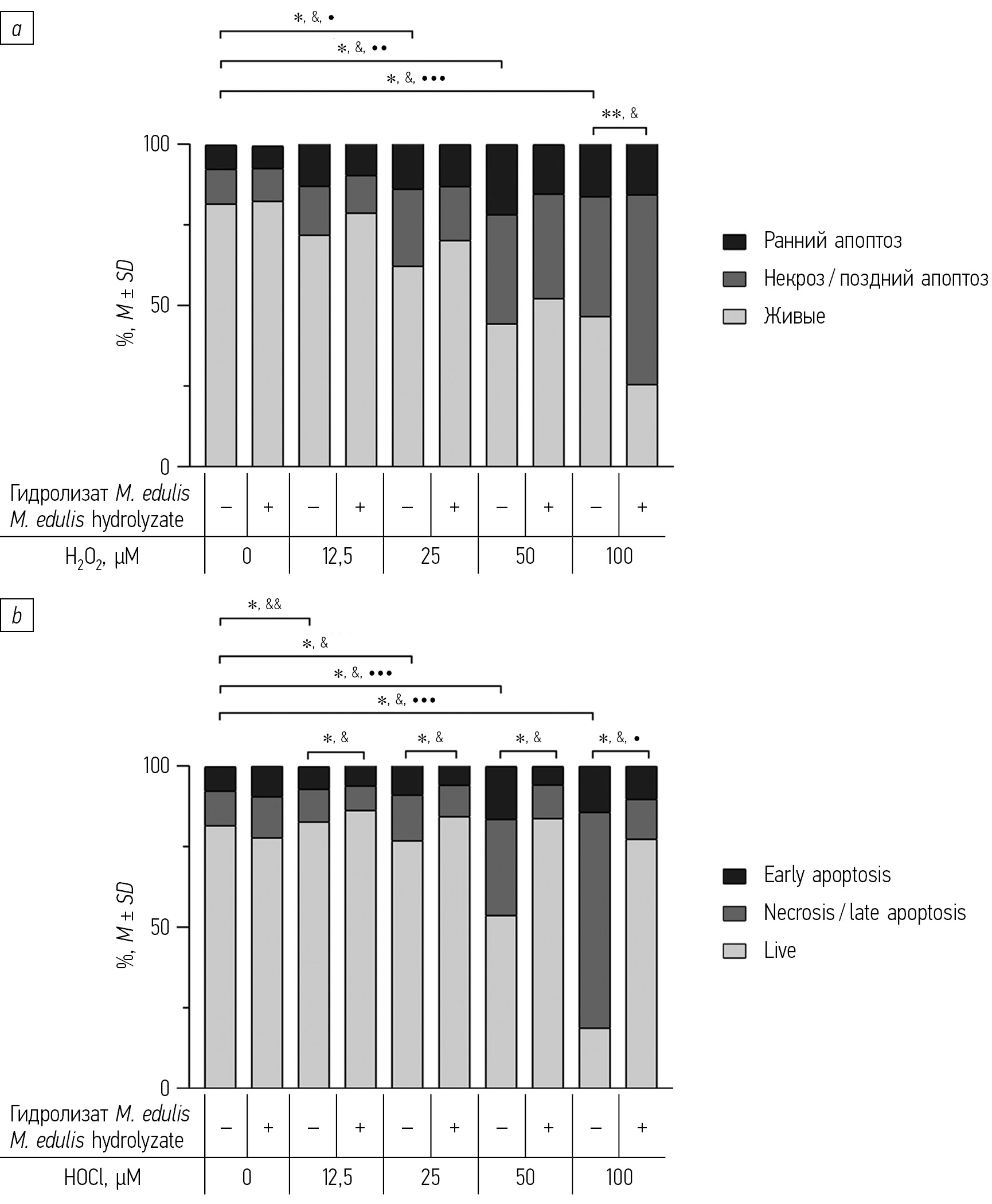 Рис. 3. Влияние гидролизата M. edulis на жизнеспособность эндотелиальных клеток EA.hy926 после инкубации в присутствии H2O2 (a) и HOCl (b). Гидролизат M. edulis вносили в разведении 1 : 5 по объему. Жизнеспособность клеток оценивали путем окрашивания флуоресцентными красителями Yo-Pro и йодидом пропидия, которые свободно проникают в клетки, находящиеся в состоянии раннего апоптоза и некроза/позднего апоптоза соответственно. Образцы анализировали с помощью проточной цитометрии. Отличия достоверны для живых клеток: * р < 0,001, ** р < 0,05; для клеток в состоянии некроза: & p < 0,001, && p < 0,01; для клеток в состоянии апоптоза: ●●● p < 0,001, ●● p < 0,01, ● p < 0,05; n = 3