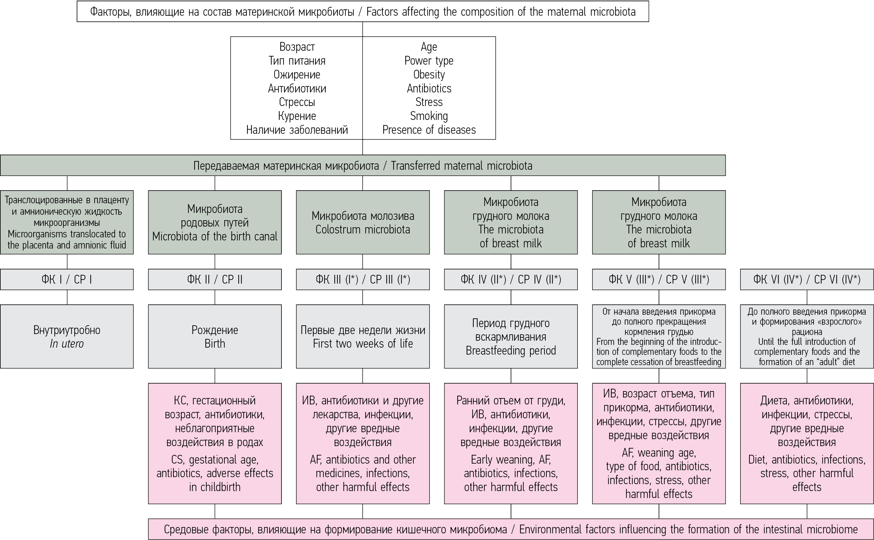 Фазы формирования кишечного микробиома и факторы, влияющие на этот процесс, суммированы на рисунке.