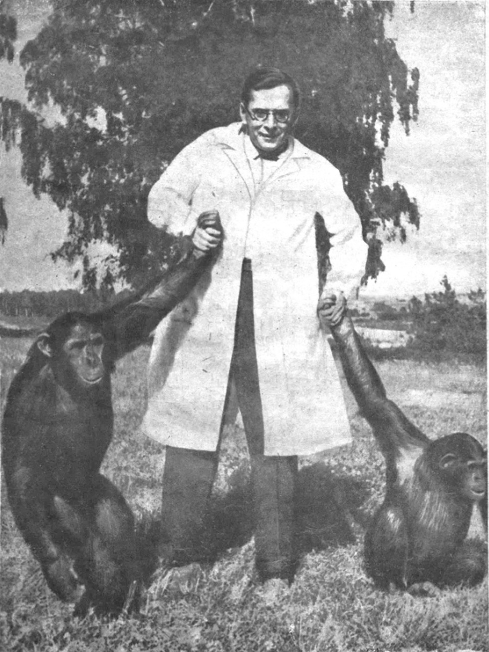Петр Константинович Денисов. Подпись под фотографией: «В Ленинграде закончился XV Международный конгресс физиологов. Собравшиеся со всех концов света ученые поделились опытом своей работы, продемонстрировали свои достижения. Иностранные ученые единодушно отметили огромный рост советской науки и те необъятные возможности, которые открыты перед советскими учеными. На снимке: ассистент академика И.П. Павлова, работы которого стояли в центре внимания конгресса, — тов. П.К. Денисов — на прогулке с подопытными обезьянами — “Розой” и “Рафаэлем”. Фото Я. Халипо» [10]