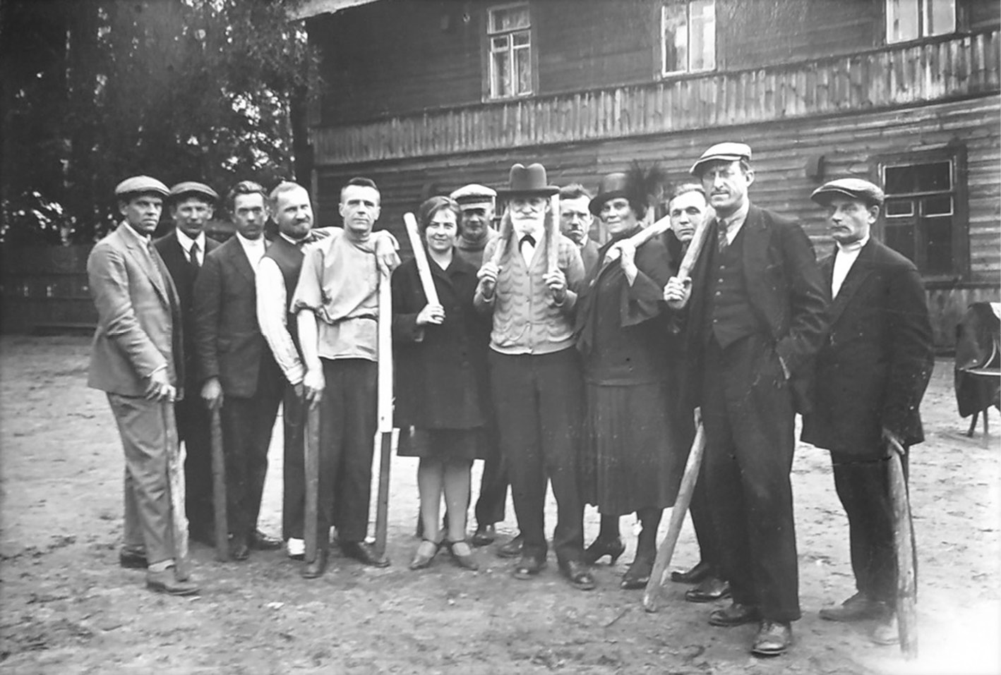 I.P. Pavlov (centre) and his comrades-in-arms before a game of skittles, Koltushi (27.09.1929). From left to right: S.N. Vyrzhikovsky, R.A. Merzen (foreman of the Biological Station in Koltushi), L.O. Zevald, V.I. Pavlov, A.D. Speransky, G.O. Vyrzhikovskaya, I.S. Rosenthal, I.P. Pavlov, G.V. Skipin, M.K. Petrova, F.P. Mayorov, L.N. Fedorov, A.N. Potemkin (driver of I.P. Pavlov) [24]